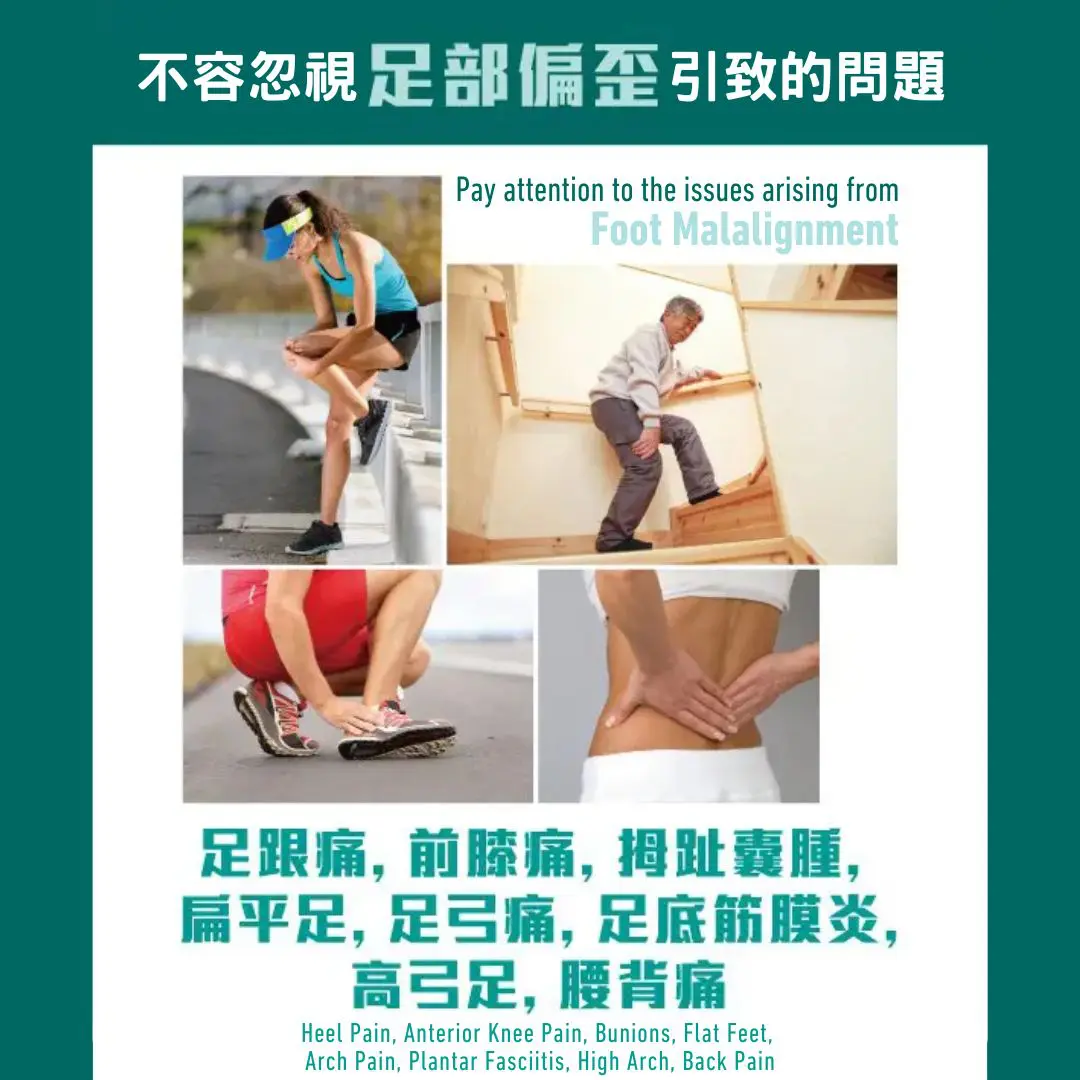 根據流行病理學的研究顯示,大約有90%不同年齡人士出現因足部偏歪所產生異常足部生物力學問題,大部份常見的下肢痛症與足部偏歪是有很高的相關性[1,2]。醫學的硏究文獻都已充足證明,對很多常見的足膝痛問題,矯形鞋墊和拖鞋是有效的處理方案。